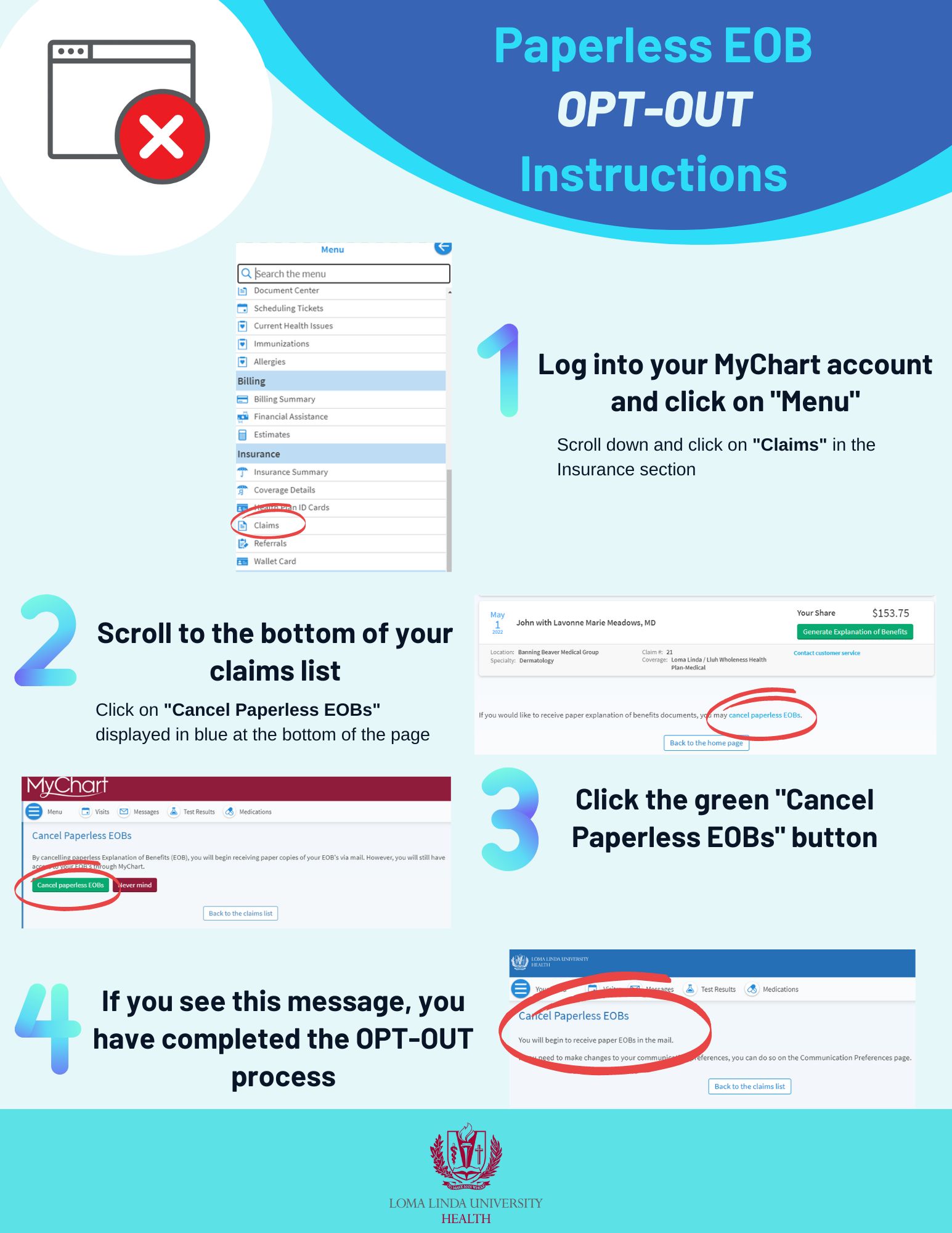 As of February 15, 2023 printed EOBs will no longer be sent to your home. You will have access to your EOBs electronically through MyChart and will receive an EOB alert as claims are processed. On February 8th you will be automatically opted-in for paperless EOBs, however, you can opt-out and receive printed copies at any time.