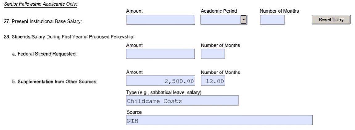 - For the first year requested, all fellowship applicants are required to specify the requested childcare costs in field 28b (Supplementation from Other Sources: Amount, Number of Months, Type, and Source) on the PHS Fellowship Supplemental Form (See screenshot).